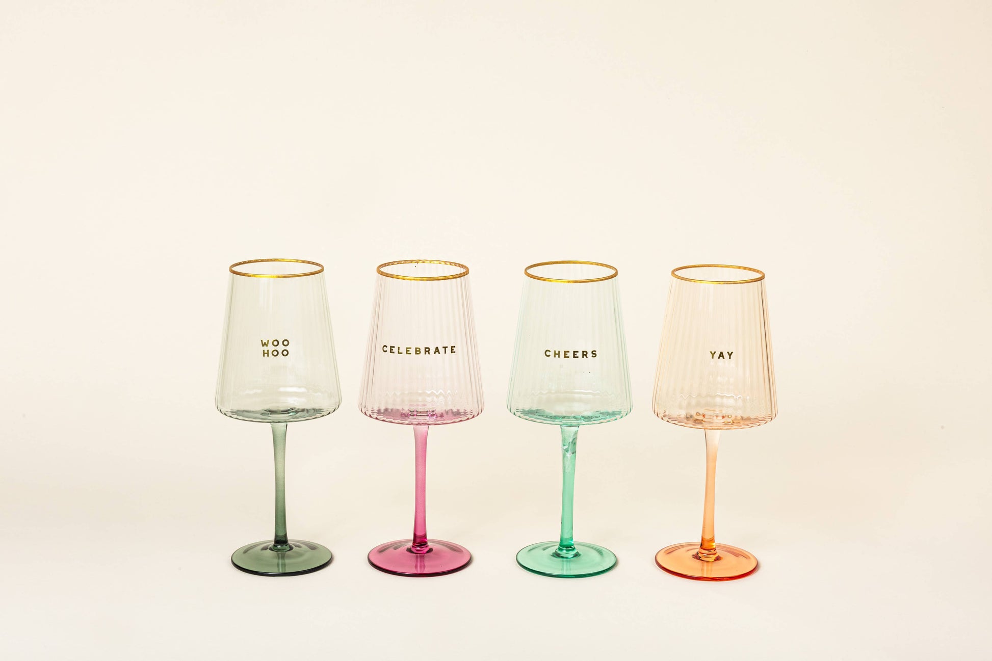 Cheers to all of life's best moments with our 16oz ribbed wine glass. This glass is made of peony ombre lead-free crystal glass, and features a gold rim. Reads CELEBRATE in small gold foil print. Hand wash only.