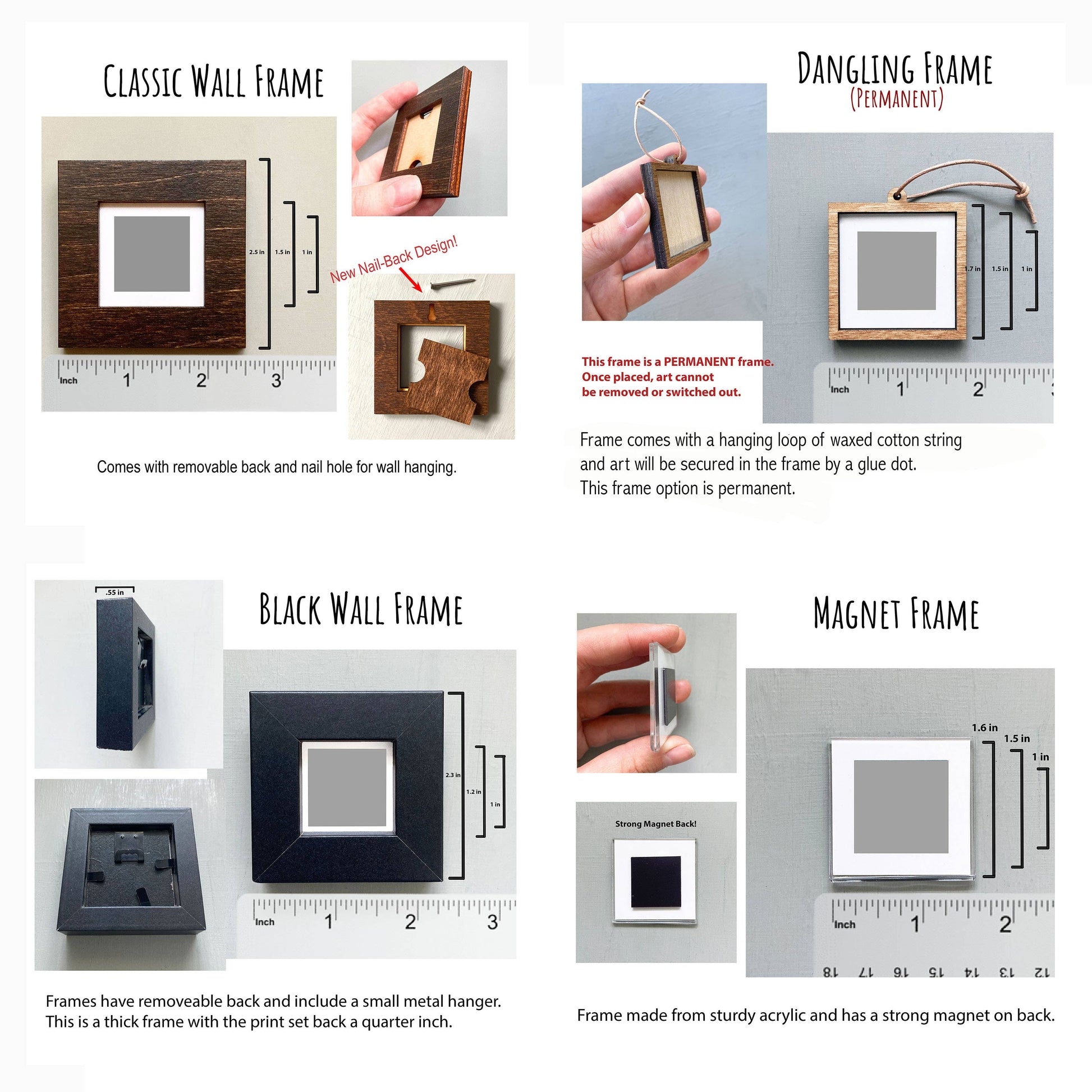 This framed print showcases a 1 inch by 1 inch painting housed in one of four frame options. Frame options include a sturdy acrylic magnet frame, a wooden dangling frame with string, a thick black wall frame, and a wooden wall frame. Art comes placed within frames and wrapped in cellophane with a branded sticker on the back.