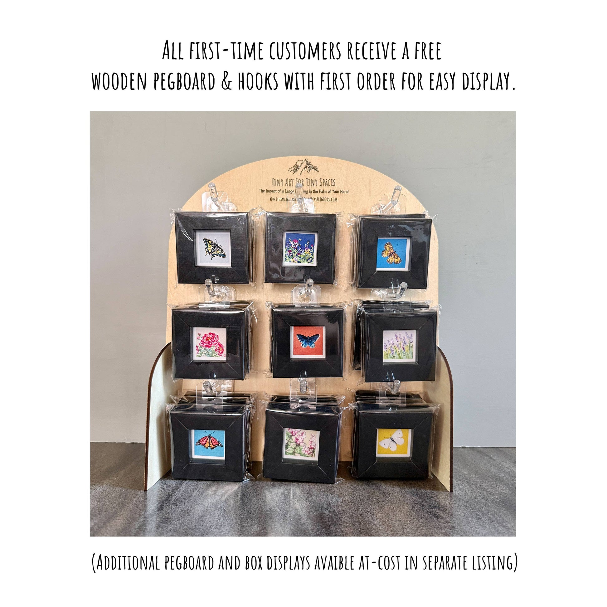 All first time orders will include a complimentary wooden display pegboard with 9 hooks for easy merchandising. (Additional displays can be purchased at-cost separately.)