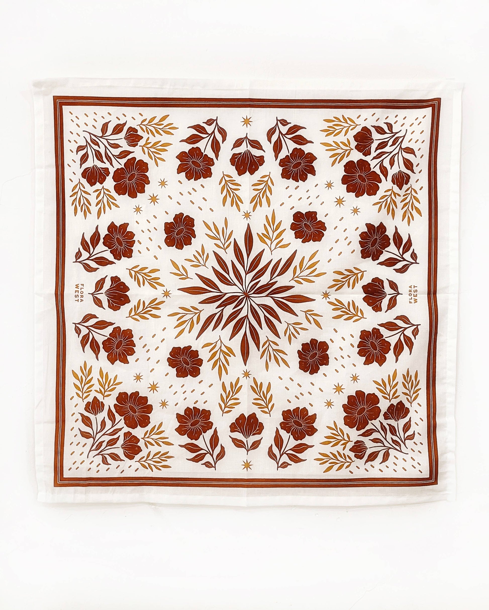 For those that prefer the touch of cotton better, and more casual style.100% organic cotton bandanas are screenprinted in India based on a hand illustrated Flora West Design exclusive artwork. This Desert Floral colorway is a gorgeous western style, with floral illustration and starburst details. It has golden yellow and earthy brown illustration on a warm white cotton background. Bandanas measure 23”x23”. This is slightly larger than a standard adult sized bandana at 22”. Can be worn around the neck, or tied comfortably around the head as a headband.